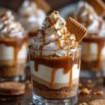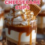 Delicious Cookie Butter Cheesecake Cups featuring a crunchy cookie crust, creamy cheesecake filling, and luscious cookie butter layers, topped with whipped cream and extra cookie crumbs for an indulgent dessert perfect for any occasion.